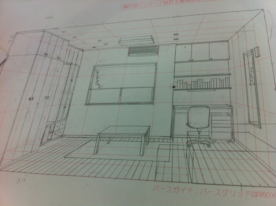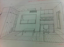 デザインの専門学校、絵本学科に通っている19歳の女の子の部屋です。部屋全体を白でまとめ清潔感を出し、アクセントカラーに、絵本の創造に刺激を与える赤を使いました。コレクションや資料となる絵本をたくさん収納出来るように、書棚だけでなく、ワークデスクの上にも本棚を設けました。絵を描くために、テーブルは資料や絵の具、色鉛筆などを広げられるよう作業用として大きくとり、作業がしやすいように、テーブルの上にはダウンライトをつけました。ベッド周りには明るくなりすぎないようナイトランプだけの光に頼り、暗すぎず明るすぎず、ゆったりと安らげるようにした。絵本の制作をしない時には、友達を呼んでも狭くならないよう、余計な家具は置かずに室内空間を広く取りました。