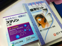ものもらい結膜炎に、の抗菌目薬と眼帯だお