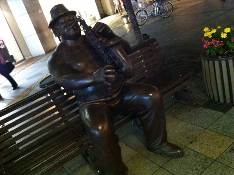 おじさんがベンチに座りながらサックス吹いてて、