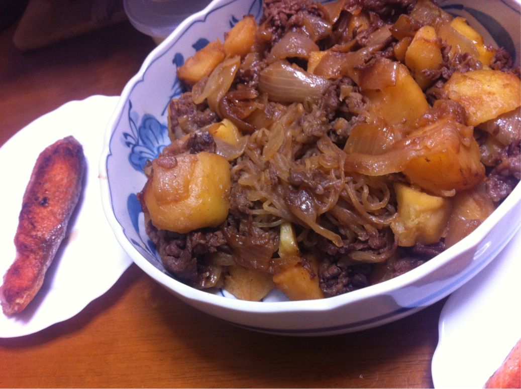 肉じゃが、大量だったから混ぜ来れてなくて焦げてたんだけど、